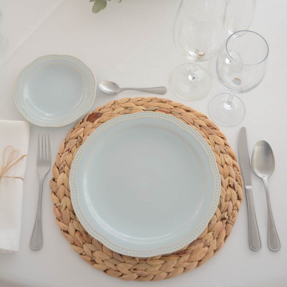 Con un diseño trenzado muy discreto y bonito, puede ser el complemento perfecto para tu evento y/o celebración. Gracias al color natural que tiene este bajoplato, queda perfecto para combinar con colores neutros y aportar un toque retro a tu mesa. Si aceptas nuestro consejo, combínalo con su plato para pan jacinto natural, que presenta el mismo diseño y acabado, y crea una mezcla perfecta y en sintonía en tu mesa.