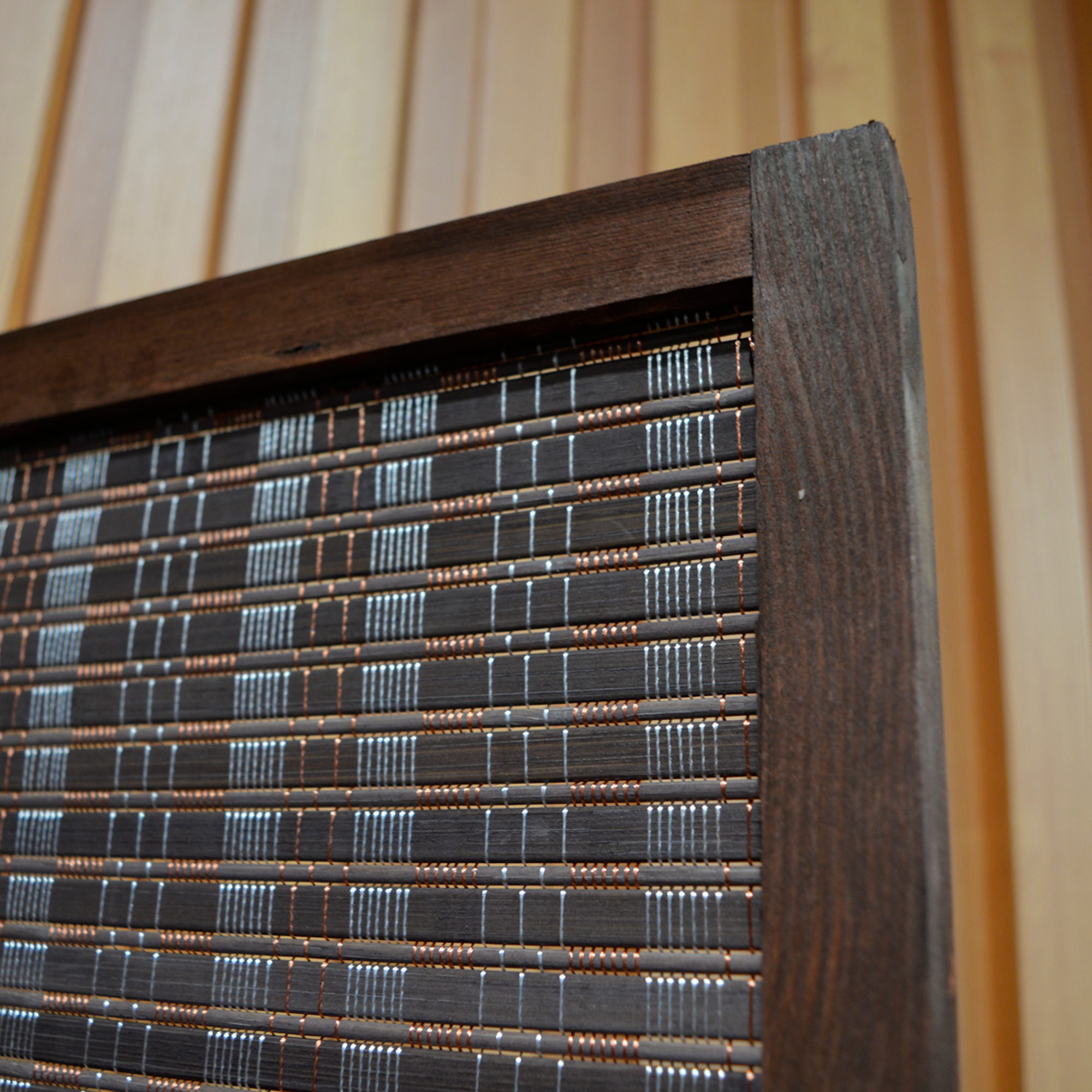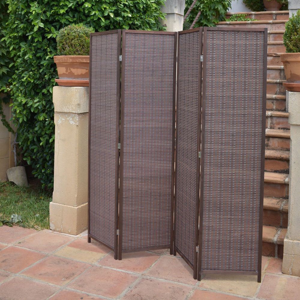 En EME Mobiliario cuidamos al máximo los detalles de nuestros biombos para así, ofrecer una solución de calidad a nuestros clientes. Este biombo cuenta con una estructura de madera, que es la que hace que sea un biombo sólido y resistente, y en su interior está fabricado con un bonito trenzado de mimbre. Todo ello, con un precioso acabado nogal. También tiene una especie de patas en cada una de las esquinas que elevan al biombo del suelo, protegiéndolo frente a la suciedad y a la humedad.