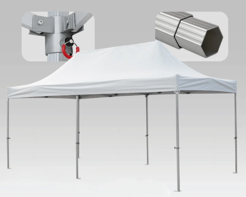 En EME Mobiliario cuidamos al máximo todos los detalles y por eso, hacemos una apuesta importante en la selección de los materiales de cada uno de nuestros productos. Es por eso que nuestra Carpa Plegable 4×8 Aluminio es una carpa que cuenta con una estructura de aluminio de alta calidad que cuenta con unos tubos de un diámetro de 50mm aproximado. Además, para incrementar la estabilidad de la carpa cuenta con anclajes al suelo y vientos adicionales, lo que hace que sea ideal para el uso intensivo profesional. En cuanto a la estructura del techo, cuenta con un mástil reforzado para una mayor seguridad y estabilidad. Esta carpa cuenta con un mecanismo de tijera que posibilita tanto un montaje como un desmontaje rápido a pesar de ser una carpa estable y segura.