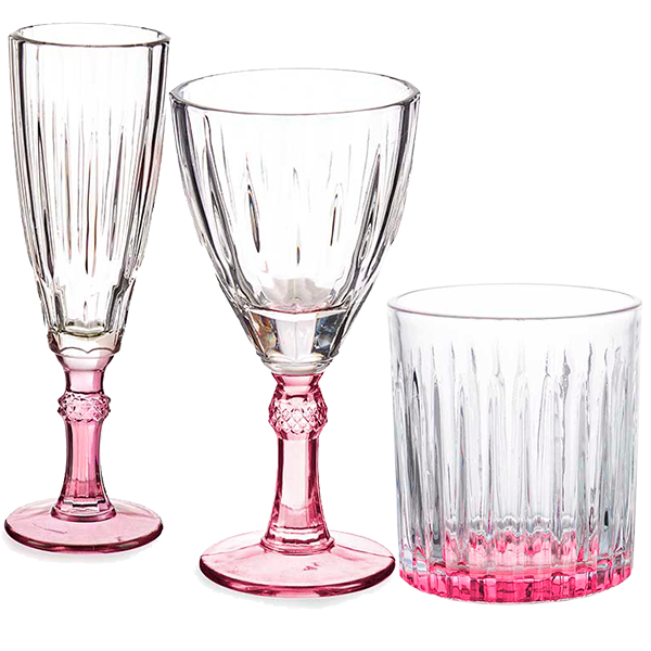 - Set de Cristalería Rosa y Set de Cristalería Azul. Un set compuesto por una copa de champagne, una copa de vino y un vaso de agua. Un set de cristalería con un toque de color muy elegante que te dará ese toque de originalidad en la decoración de tu establecimiento de hostelería.