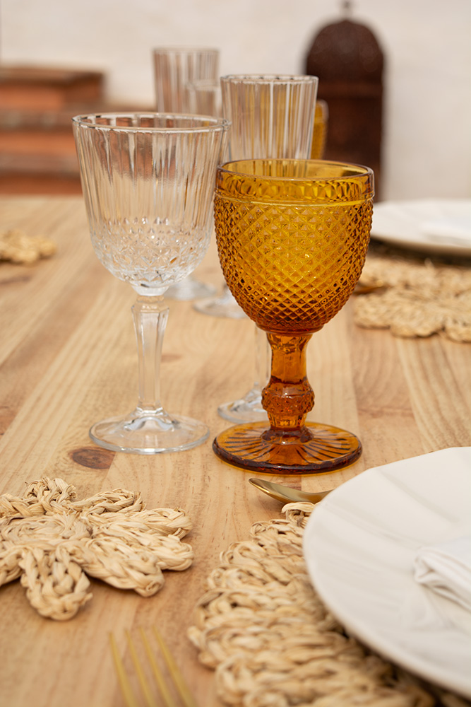 El estilo tallado aporta un aire vintage y refinado, con detalles trabajados que reflejan la luz de manera única. Su color ámbar, inspirado en la calidez de la naturaleza, transmite una sensación acogedora, perfecta para celebraciones especiales para darle ese toque exclusivo. Las líneas, patrones y formas geométricas son el elemento clave de esta encantadora copa.