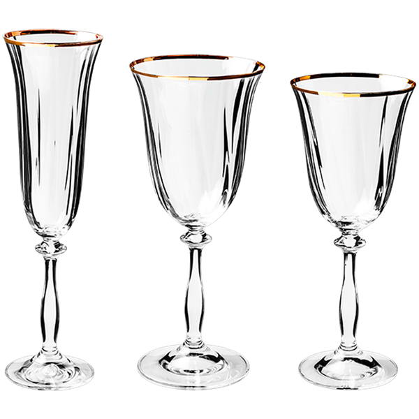 Si quieres despreocuparte de buscar el set de cristalería perfecto para tu evento y/o celebración, el set de Copas Filo Dorado es un set compuesto por copa de vino, copa de agua, copa de cava y vaso de agua que aporta elegancia en cualquier situación.