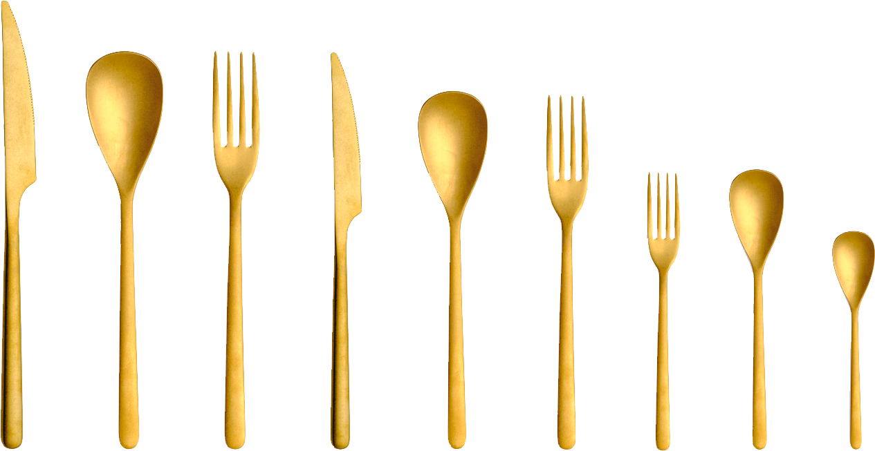 Esta cubertería le aporta un toque original, gracias a su acabado en color dorado, a cualquier decoración.