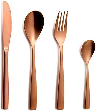 Cubertería BCN Cobre, compuesta por un total de 120 piezas es perfecta si estás buscando una cubertería completa con una silueta con líneas elegantes y un bonito acabado satinado.