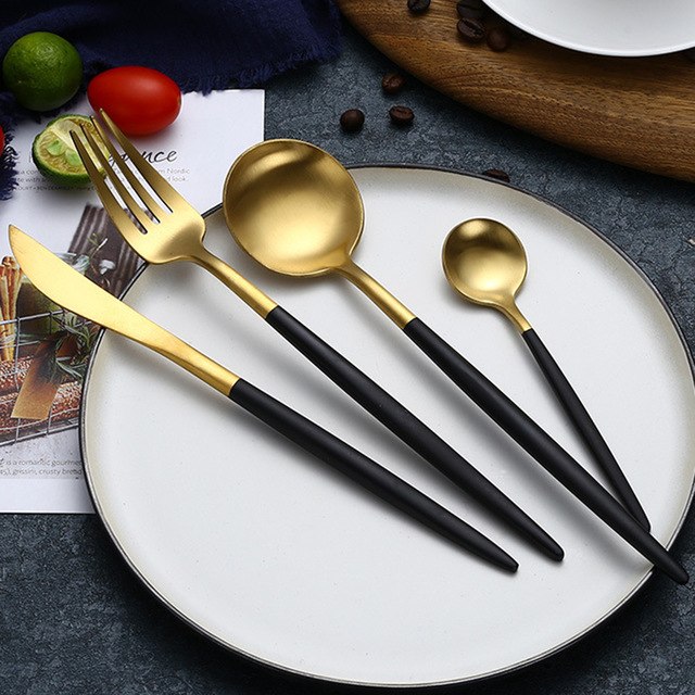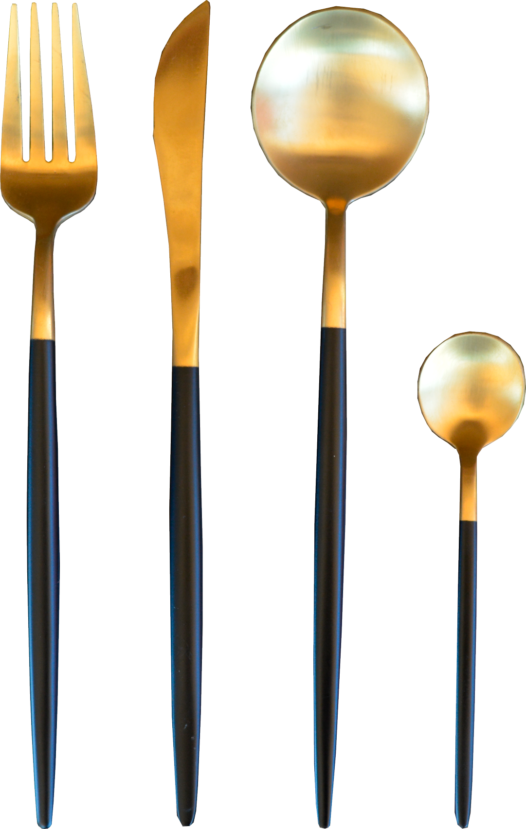Si estás buscando una cubertería versátil: ¡la tenemos! Nuestra Cubertería Deluxe Negro Oro tiene un diseño tan sencillo que es perfecta para usarla tanto en eventos como en hostelería. Además de tener un diseño muy versátil, también es una cubertería completa que nos permitirá ofrecer el servicio que nuestro establecimiento y/o evento requieren. Está compuesta por: cuchara de mesa, tenedor de mesa, cuchillo de mesa y cuchara de postre.