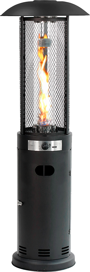 Estufa cilíndrica negra con distribución de calor 360 grados, ideal para terrazas, jardines, patios, espacios exteriores de bares y restaurantes.