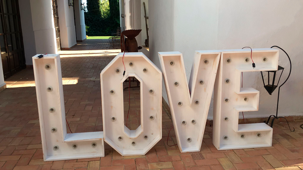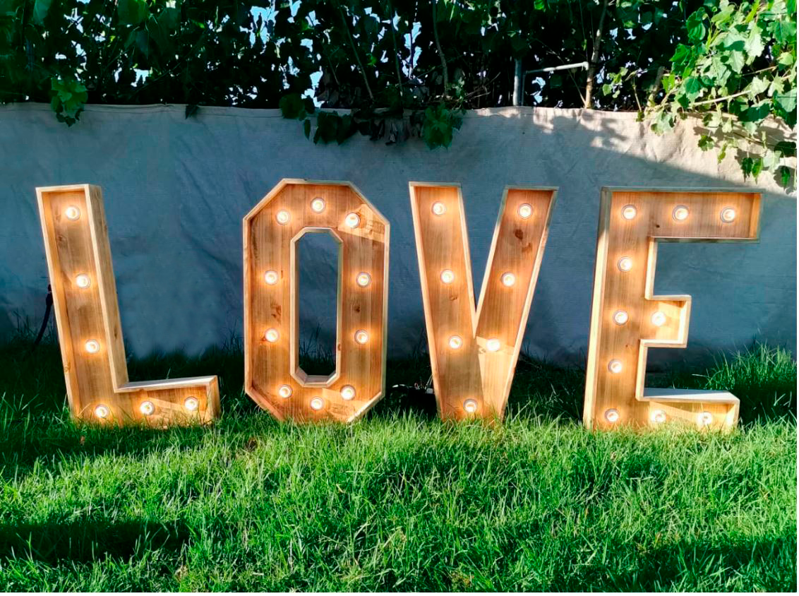 Cada Letra de Madera con Luz está fabricada en madera de pino, con un bonito acabado natural, que aporta un estilo rústico y romántico haciendo de éstas letras un elemento perfecto para utilizar en bodas, comuniones, eventos corporativos.