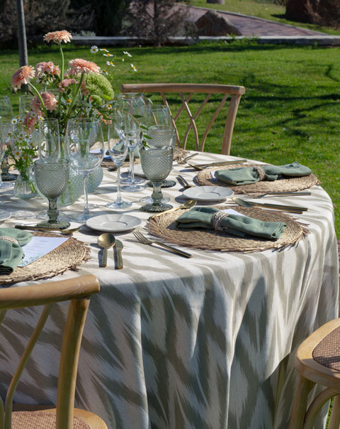 Dale un toque de frescura y sofisticación a tu mesa con el Mantel Ikat Arena, un diseño que celebra la riqueza cultural y la belleza de los estampados tradicionales Ikat. Este patrón geométrico, caracterizado por su efecto desenfocado y simétrico, evoca la artesanía textil ancestral de culturas asiáticas y latinoamericanas, ahora reinterpretado en tonos verdes vibrantes sobre un fondo claro perfecto para combinar con una amplia gama de sillas.