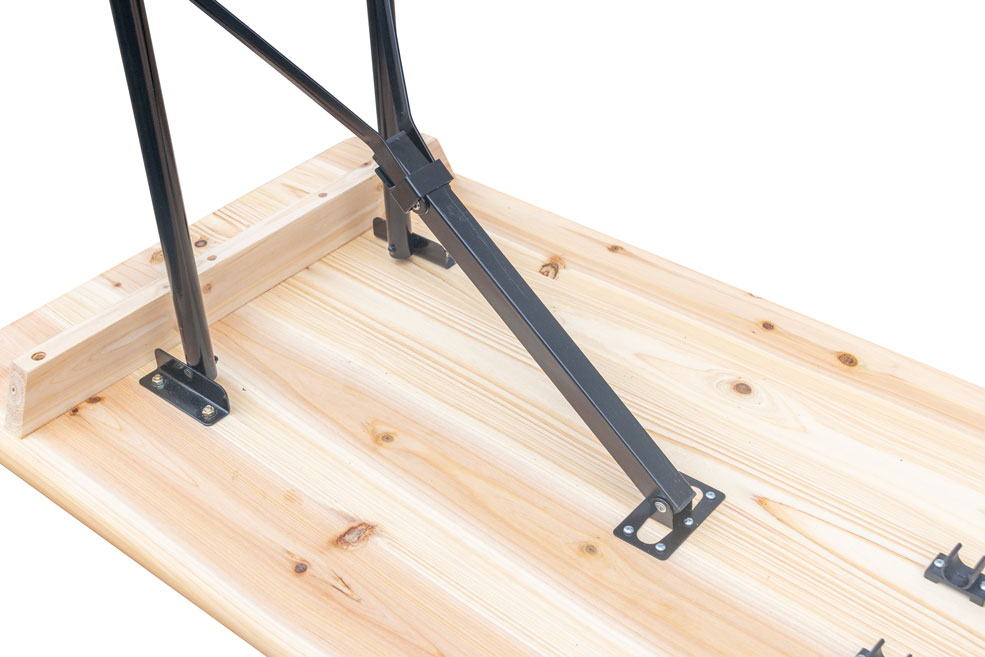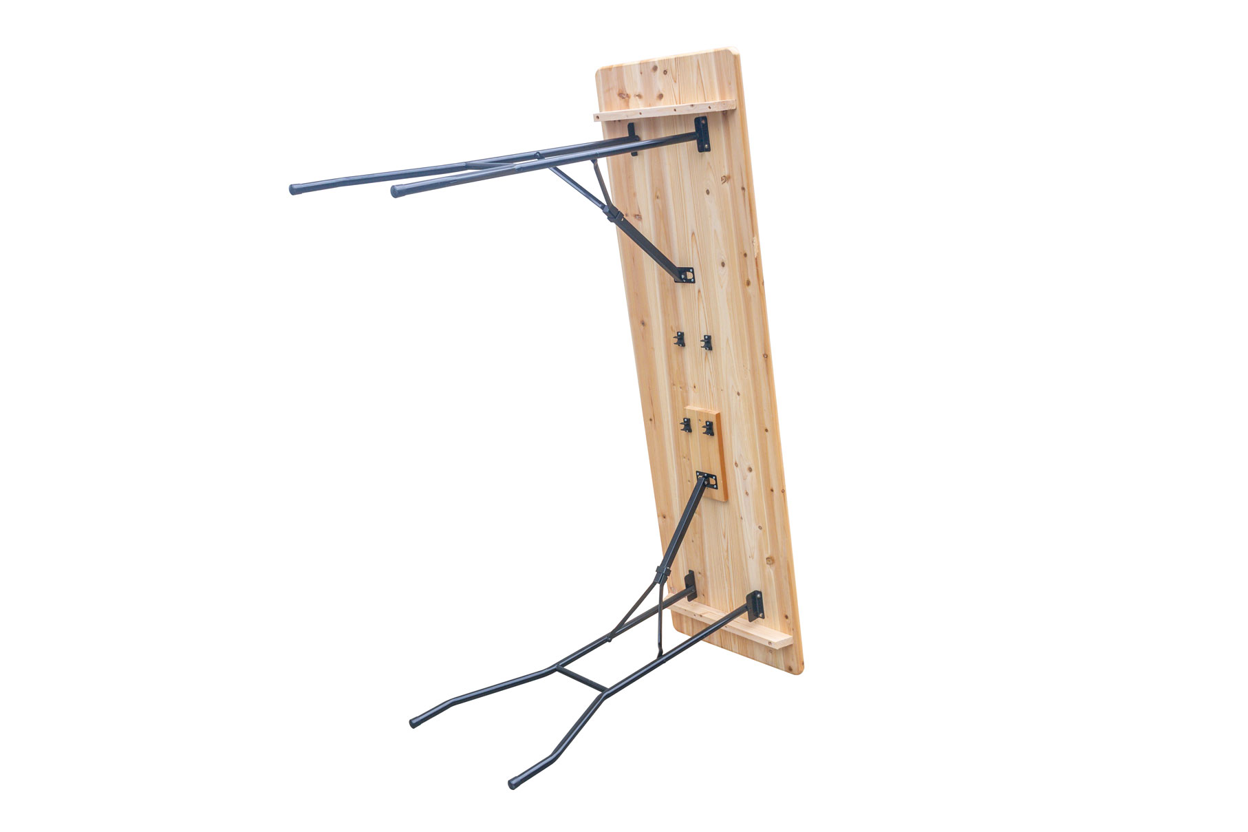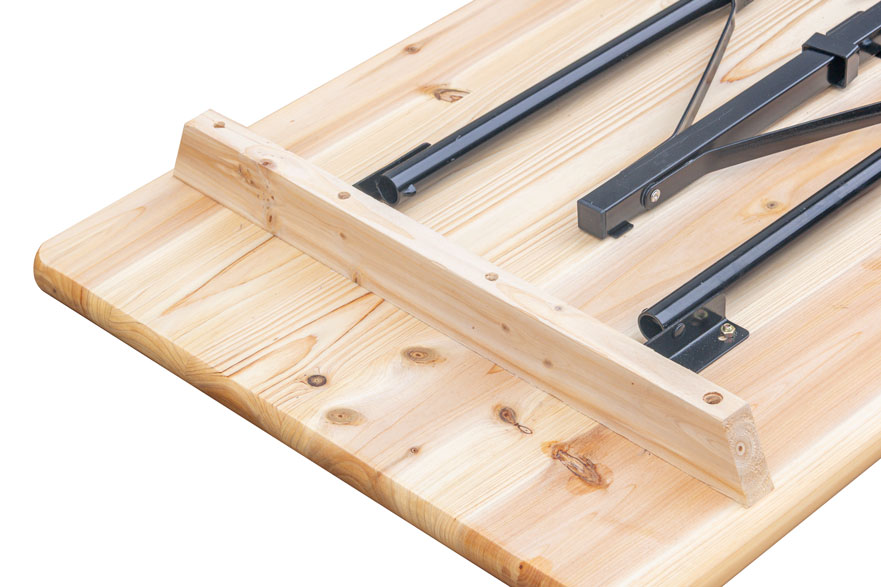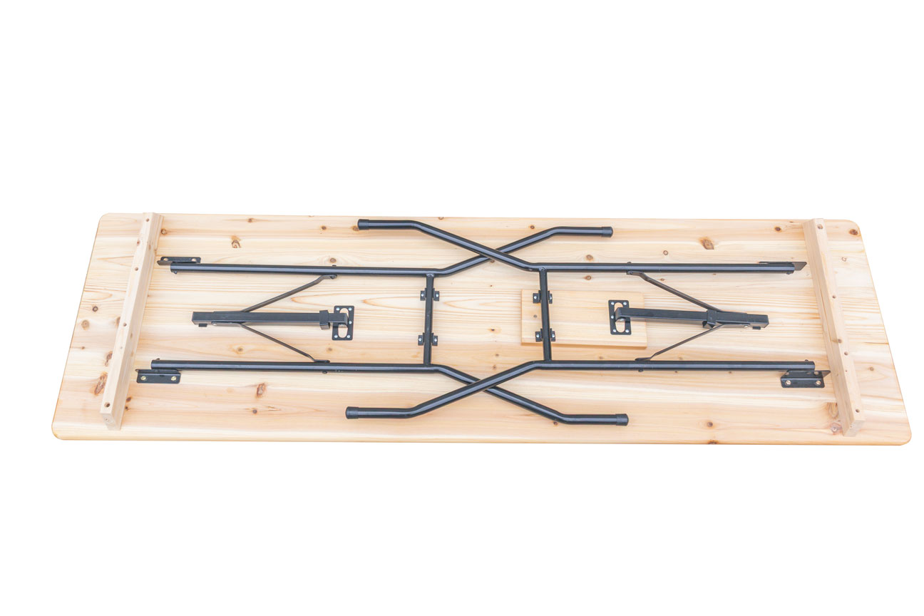 La superficie de la mesa plegable cervecera cuenta con un acabado de barniz, que protege la madera y realza su veta natural, proporcionando mayor resistencia frente a la humedad y el desgaste. Este tratamiento no solo mejora su durabilidad, sino que también aporta una estética cuidada y profesional.