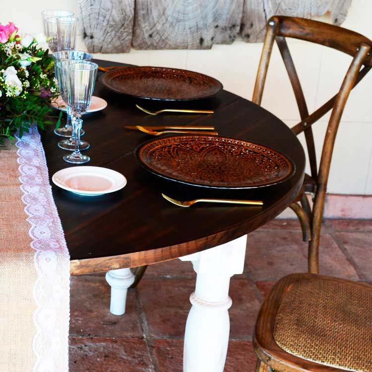 Una de ellas, nuestra Mesa Madera Rústica Redonda 150cm. Fabricada en madera de pino macizo, presenta un tablero en color nogal y las patas, torneadas y desmontables, con un bonito color blanco envejecido, que hace que sea una mesa ideal para usarla en tu evento y aportar la elegancia que necesitas.