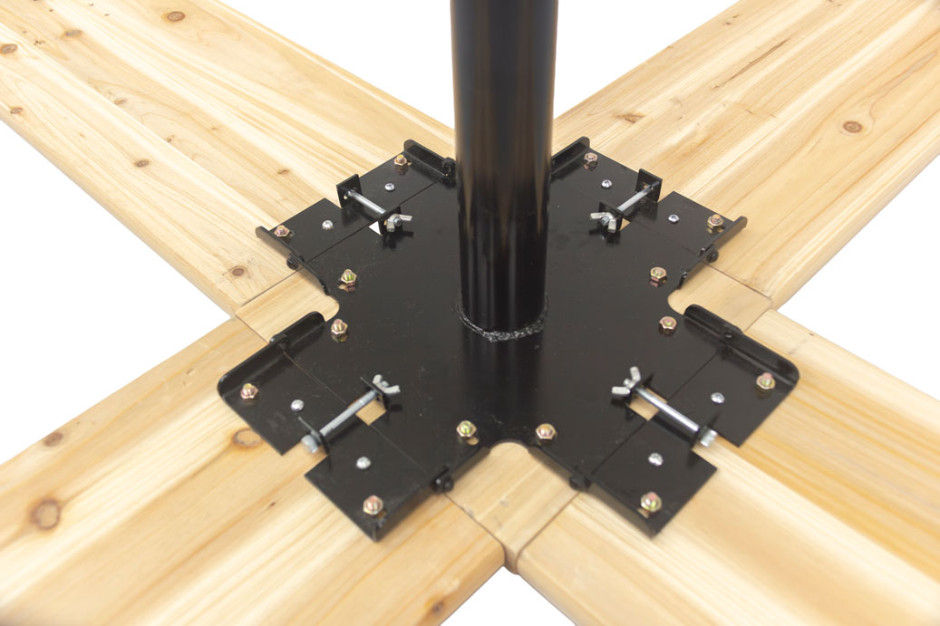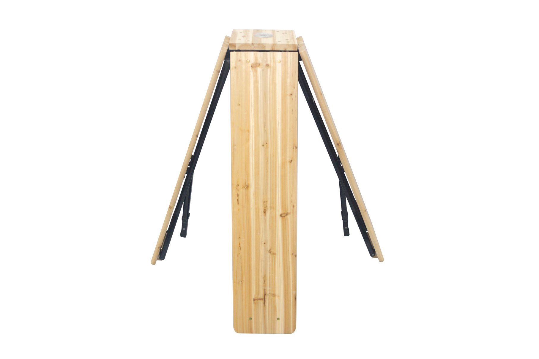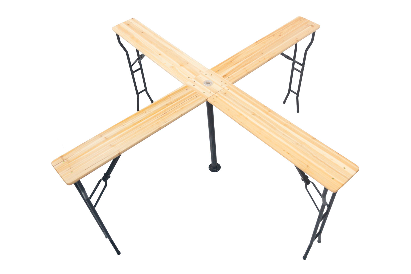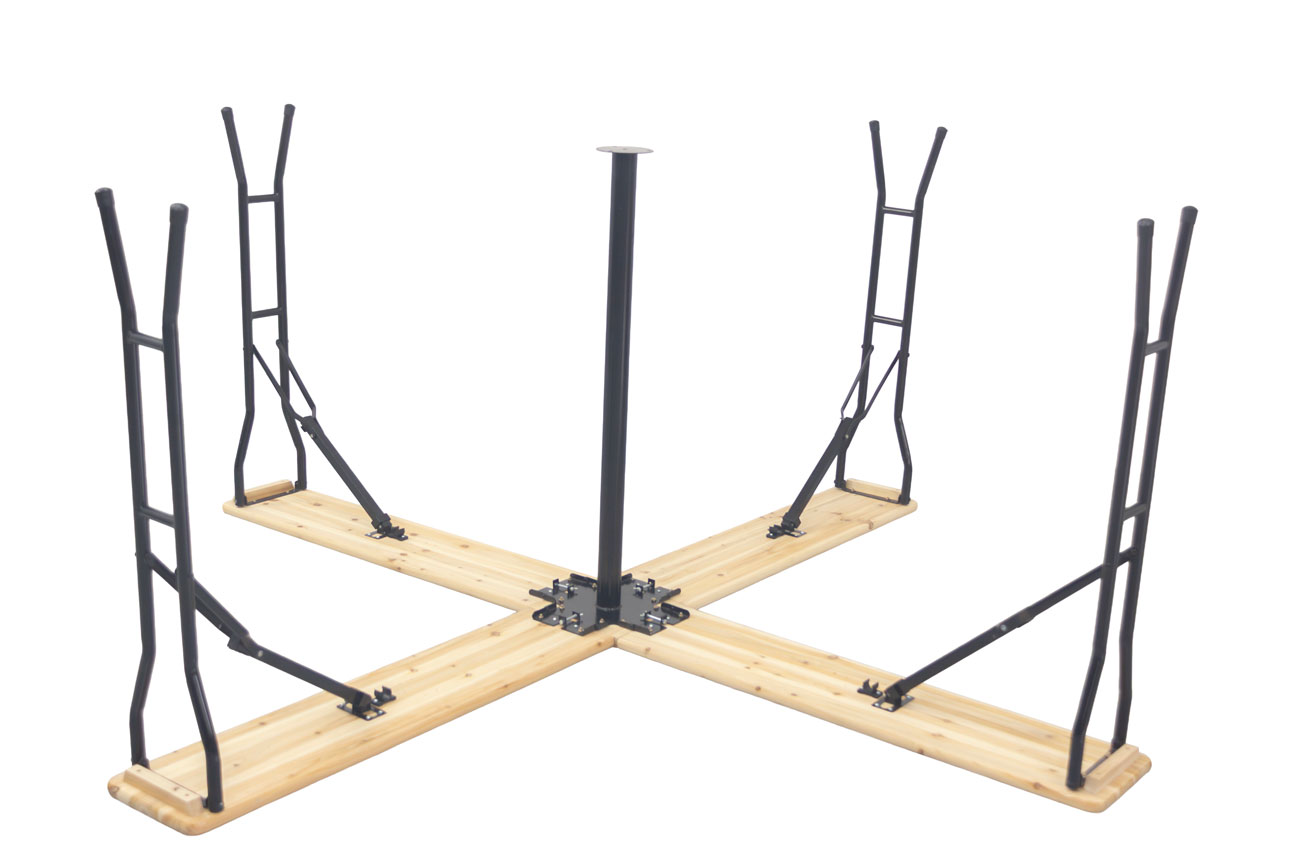 La Mesa En Cruz Plegable tiene unas dimensiones de 241cm x 241cm x 103cm, donde el tamaño del tablero es de 108 cm x 25 cm y el tamaño del centro de mesa 25cm x 25cm.