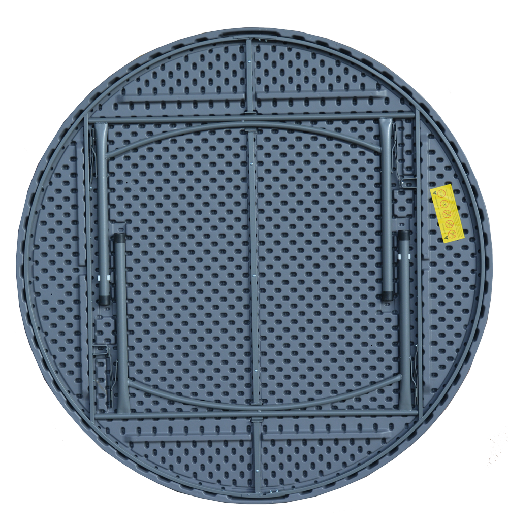 Mesa Plegable Redonda 180cm con estructura de acero pintado y sobre estanco de polietileno de alta densidad, en color gris oscuro, ideal para eventos y hostelería.