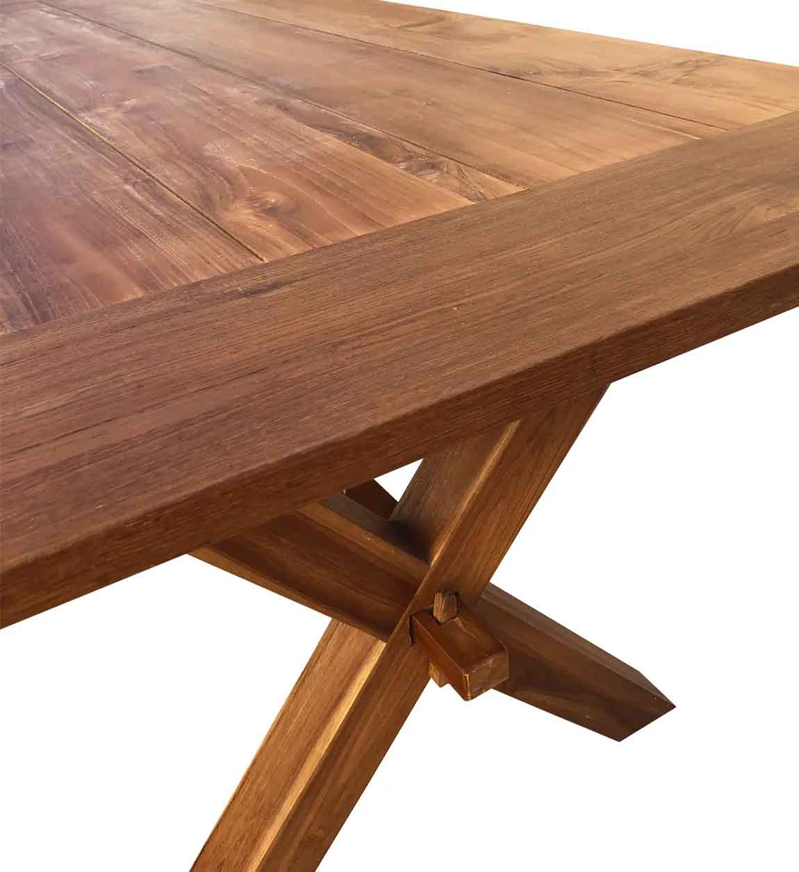 Esta mesa de comedor está fabricada con madera de teca, una de las maderas con mayor calidad que además, mantiene y mejora su apariencia y acabado con el paso del tiempo. ¡Contacta con nosotros si quieres saber más información sobre alguno de nuestros productos!