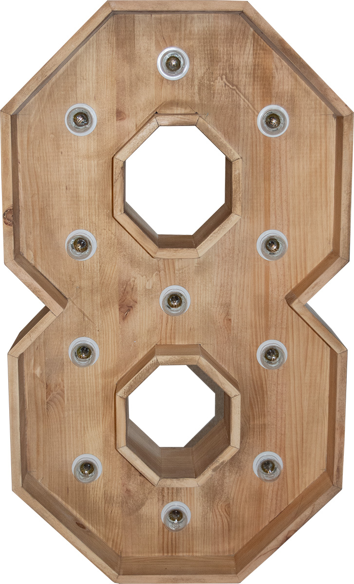 Nuestros Números de Madera con Luz están fabricados en madera de pino de forma artesanal, con un bonito y elegante acabado natural, que le aportará un estilo rústico y romántico, haciendo de estos números un elemento perfecto para utilizar en bodas, comuniones, eventos corporativos, etc.