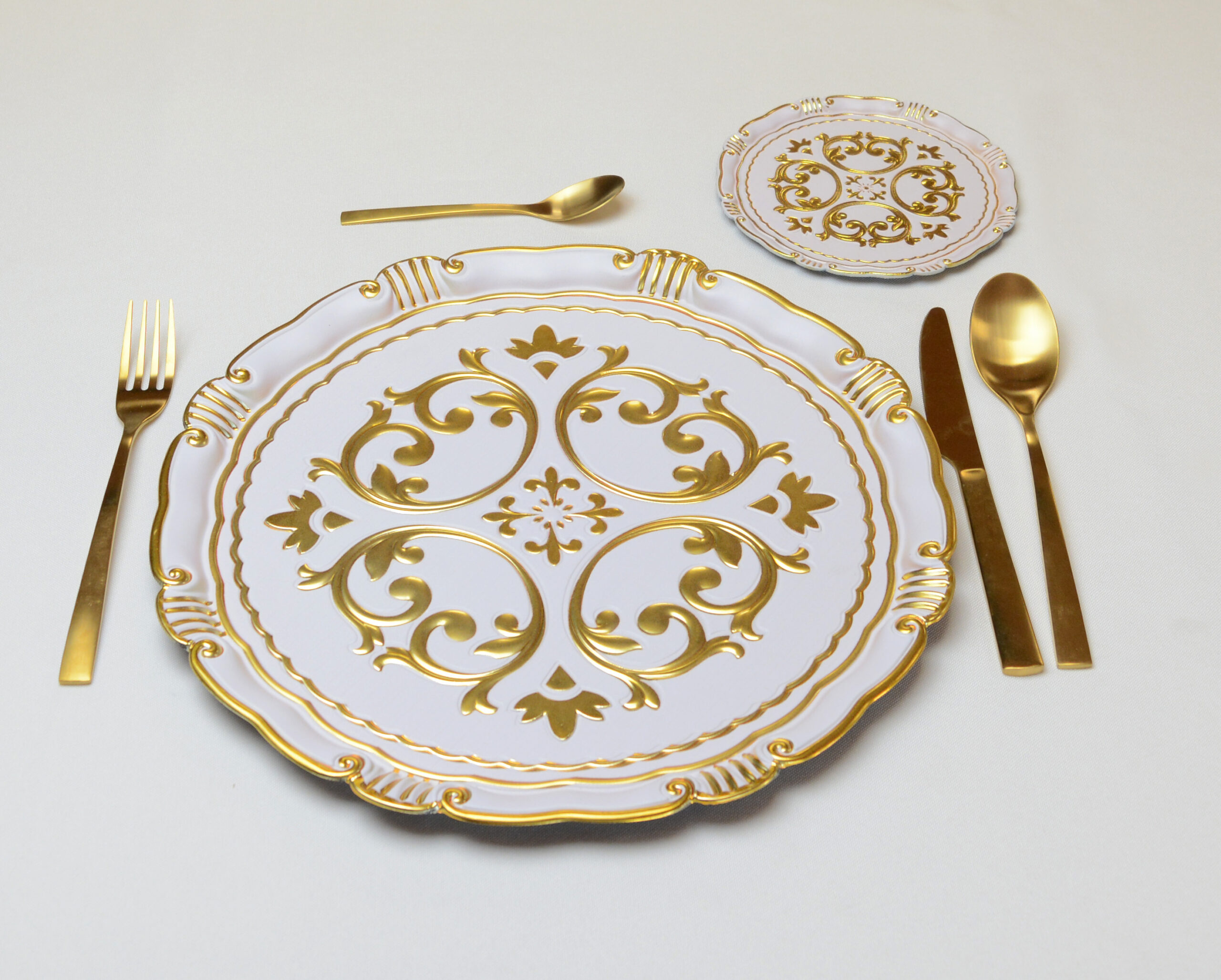 Perfecto para eventos casuales o con ambientes modernos, este set combina un bajoplato de 33cm y un plato de pan de 15 cm, ambos con detalles dorados que añaden un toque de sofisticación a cualquier mesa. ¡Resistente, ligero y tan elegante como atrevido!