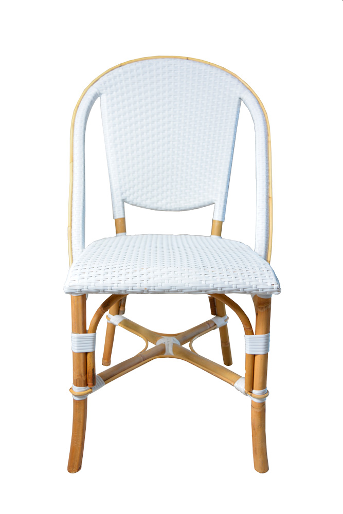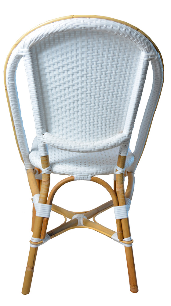 La Silla Bistro Blanca es un modelo precioso, que imita a la perfección al ratán natural con un bonito trenzado que da forma a todo el asiento de esta silla y que le aporta una comodidad excelente para aquellos que se sienten en ella.