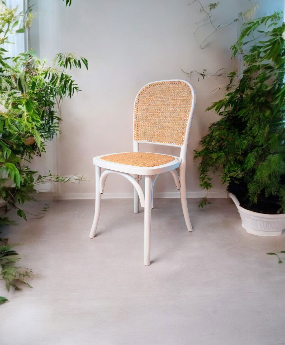 La Silla Cannage Blanca es una silla de estilo nórdico, fabricada en madera de olmo, asiento de ratán natural trenzado y respaldo de rejilla. Una silla de calidad a la par que cómoda, que te permitirá disfrutar de ella en cualquier espacio sin problema.