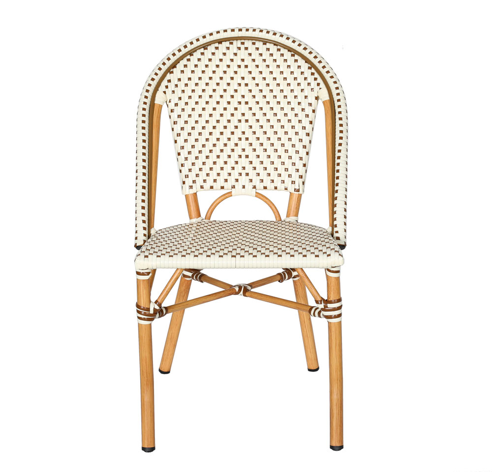 El respaldo arqueado no solo mejora la comodidad, sino que también refuerza el diseño clásico inspirado en las sillas de las terrazas parisinas. El asiento y respaldo de ratán presentan un delicado patrón en tonos blancos y beige que le aporta un toque decorativo y versátil.