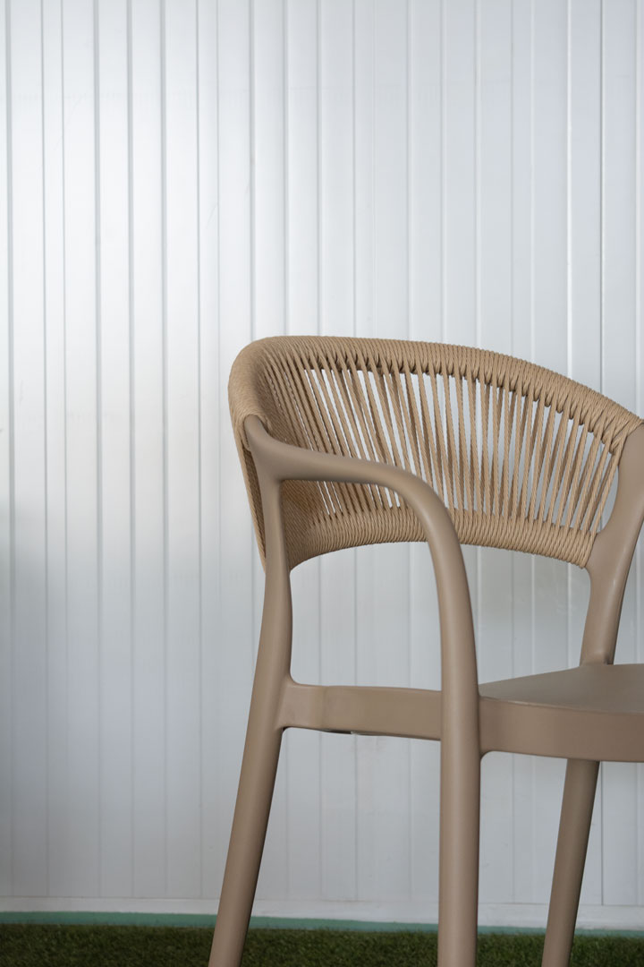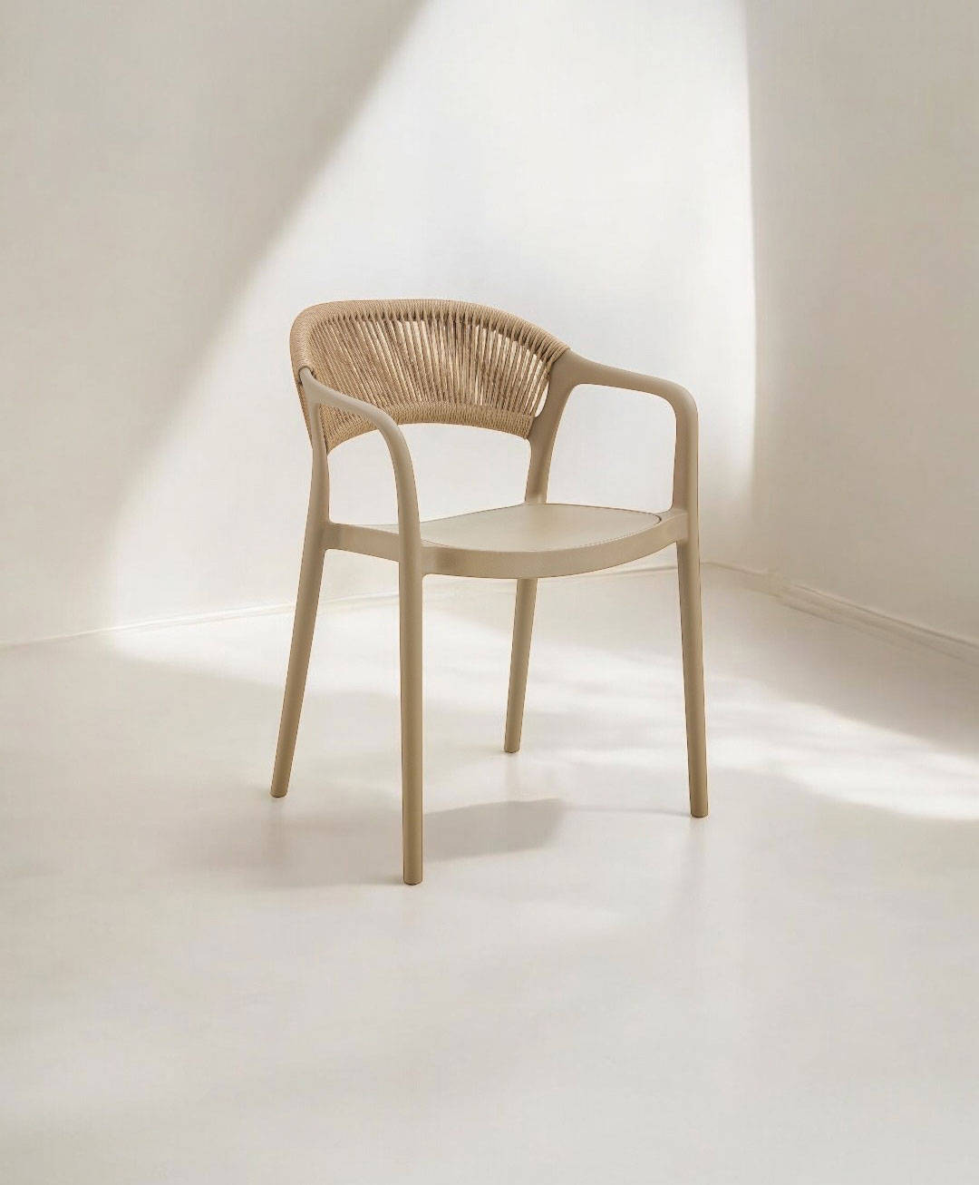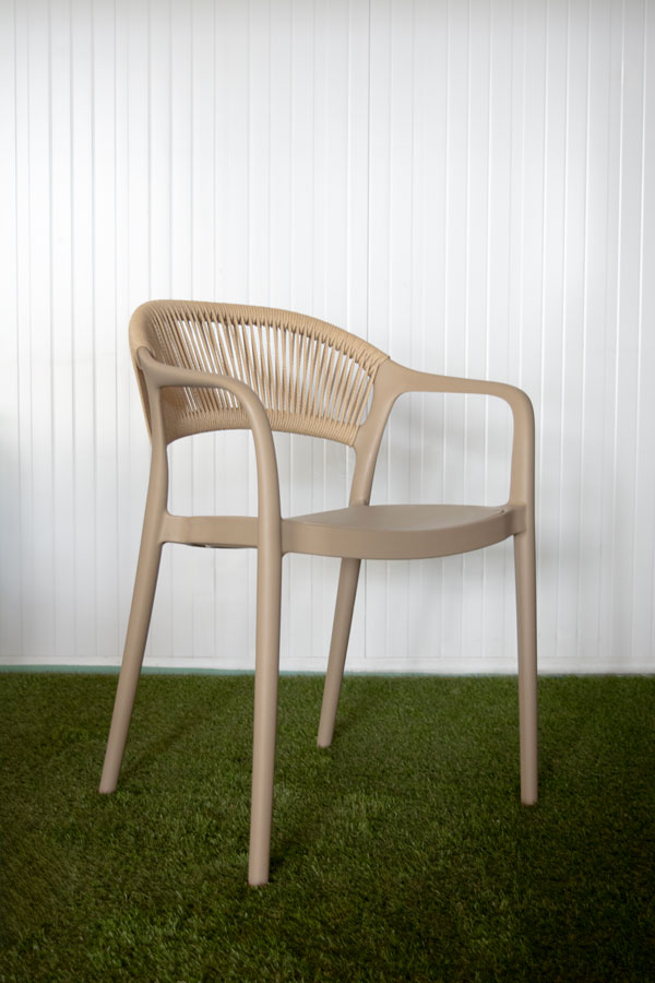 Su diseño atemporal es el que destaca por sí mismo, el tono arena aporta una estética neutra y cálida que complementa cualquier decoración, desde ambientes más modernos hasta rústicos. El respaldo incorpora un diseño inspirado en cual tiene unas cuerdas entrelazadas, añadiendo un toque de textura y personalidad sin sacrificar la ergonomía.