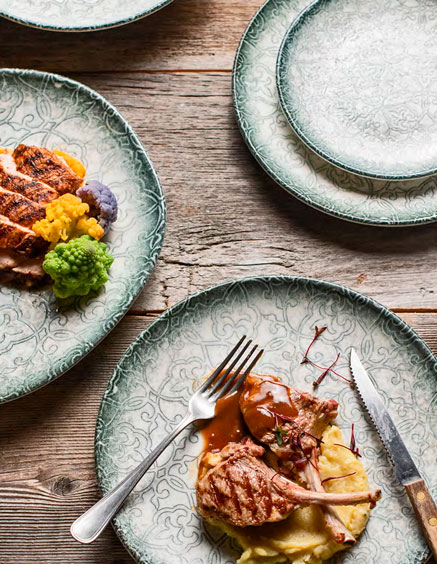 La Vajilla Tequendama Bonna es una vajilla con esencia, muy diferente y elegante. Su diseño exclusivo está basado en una cenefa con un toque vintage que, junto a los colores verdosos y la forma del plato, le dan un aire actual que hace de ella una vajilla única.