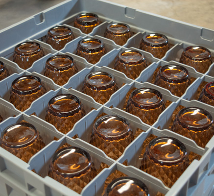 En este caso, el Vaso Tallado Ámbar requiere una cesta con base y un extensor de 25 compartimentos, que permite guardar cada vaso de forma individual y segura, evitando que los vasos se dañen durante su transporte y almacenaje.