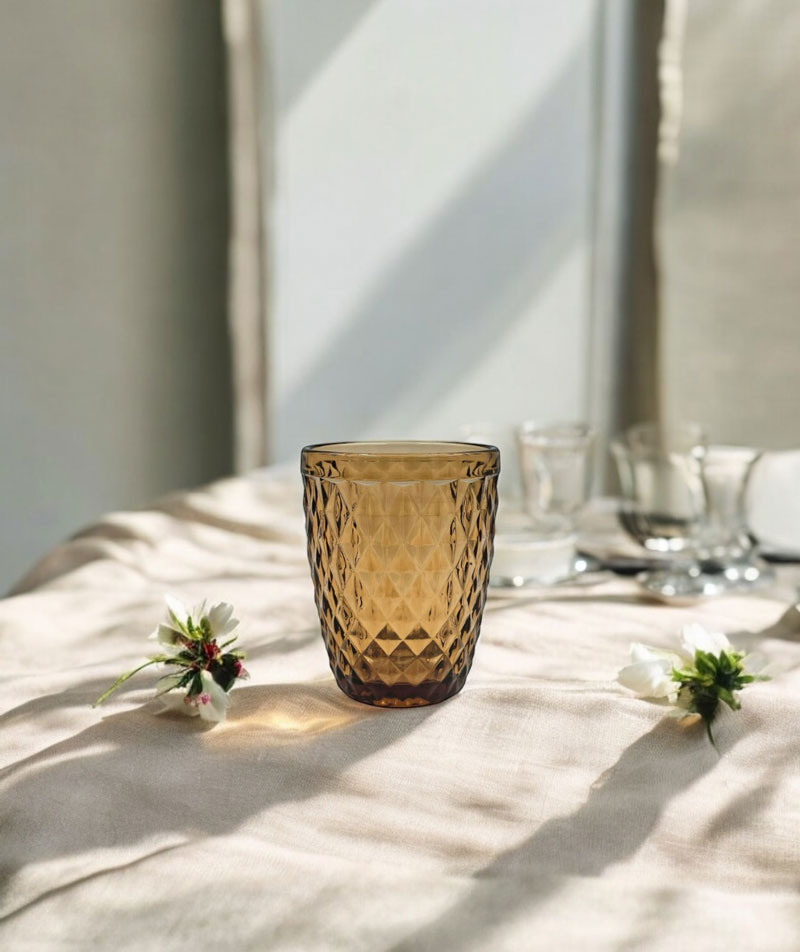 Presentamos el Vaso Tallado Ámbar, una pieza que combina la calidez del vidrio ámbar con la delicadeza de su diseño. Este vaso no solo es funcional, sino que también, una obra de arte que tienes que introducir en tu colección de cristalería y que puedas utilizar en cualquier ocasión. Perfecto para disfrutar para todo tipo de bebidas. Este vaso es ideal para quienes buscan algo único y lleno de carácter.